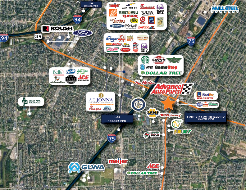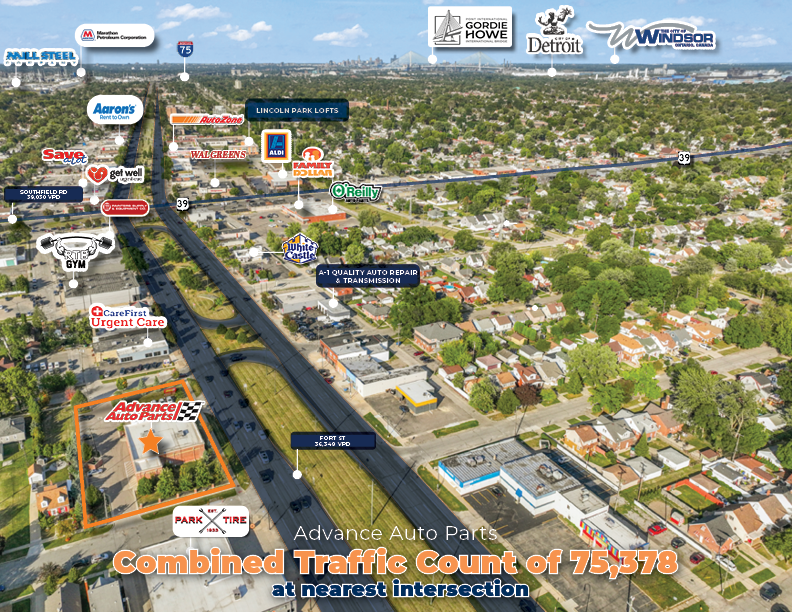 - High-traffic location with 36,348 vehicles per day along Fort Street (M-85) and a combined 75,378 vehicles per day at the nearby Fort Street and Southfield Road intersection.