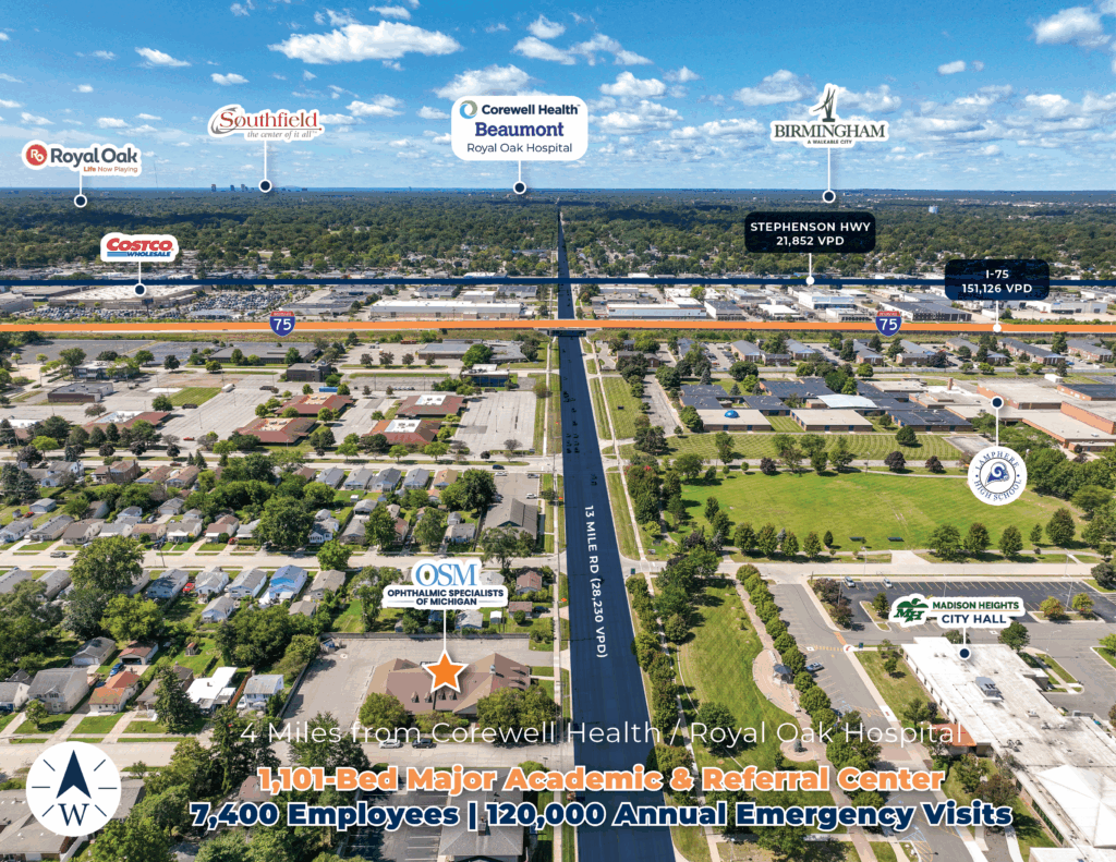 - 4 Miles from Corewell Health / Beaumont Royal Oak Hospital: 1,101 Beds, Major Academic & Referral Center