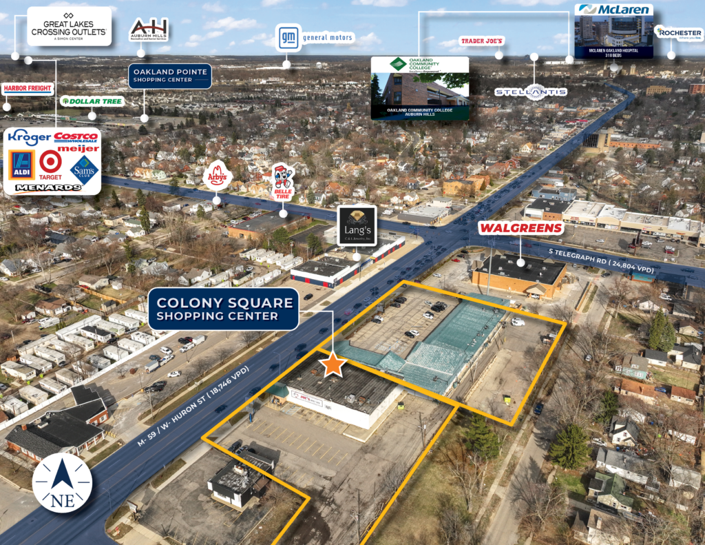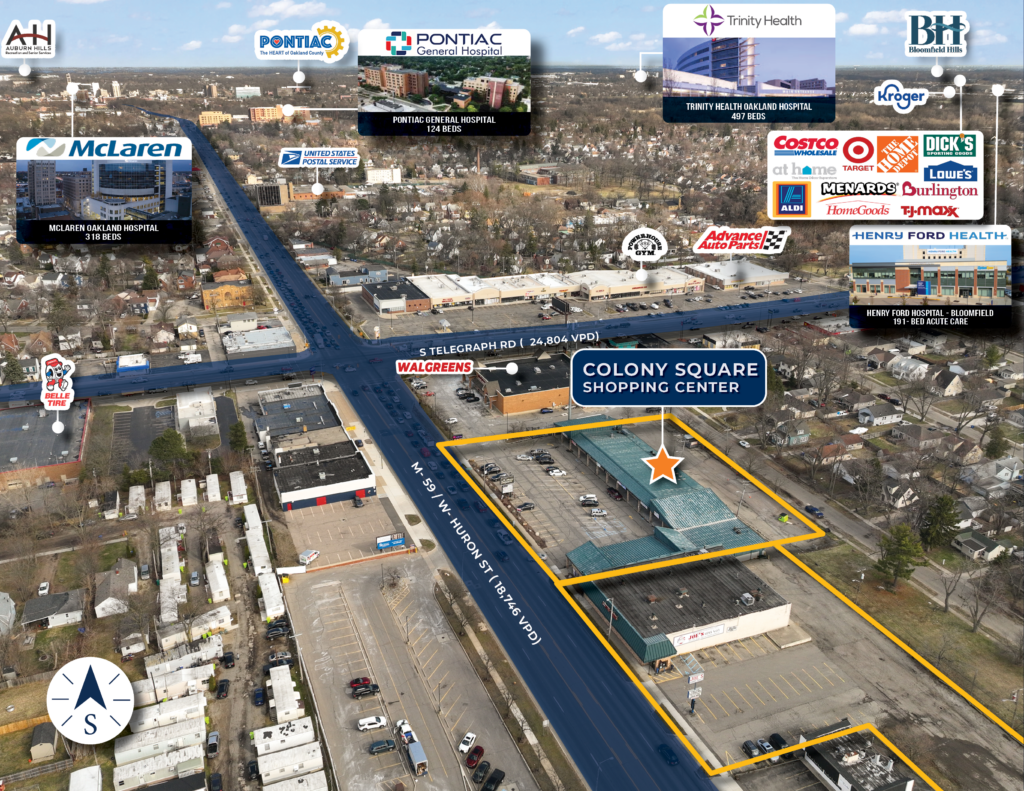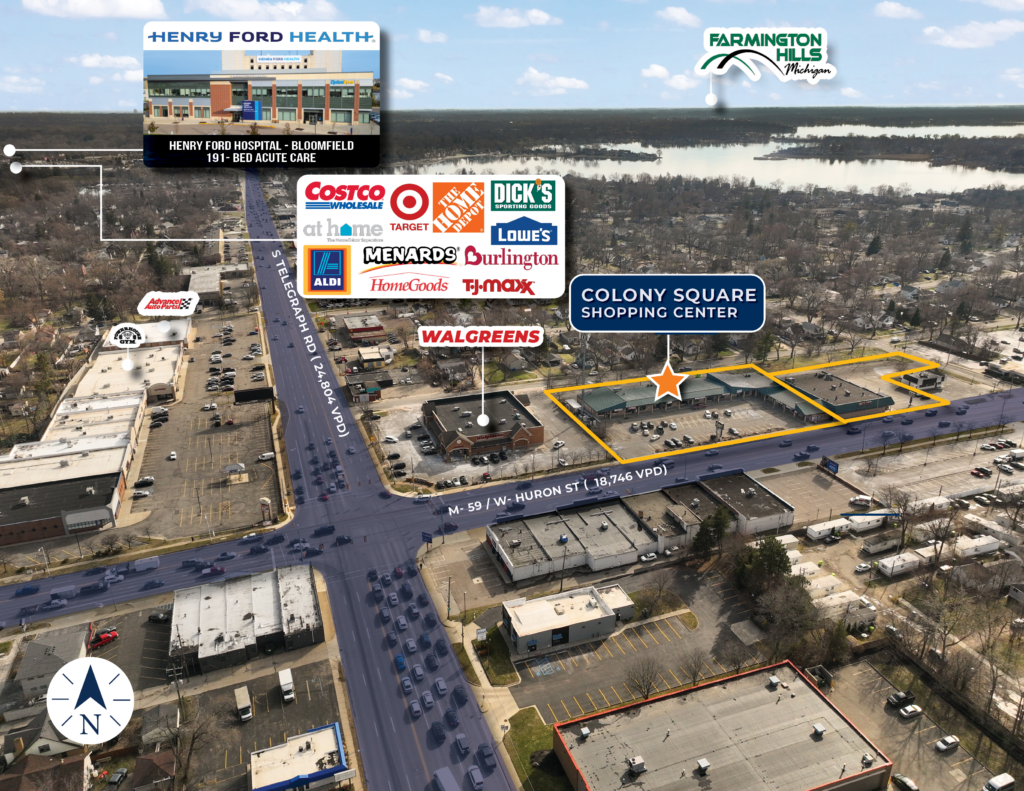 - Prime frontage near the signalized intersection of M‑59 West Huron Street and S. Telegraph Road with a combined traffic count of 43,550 vehicles per day.